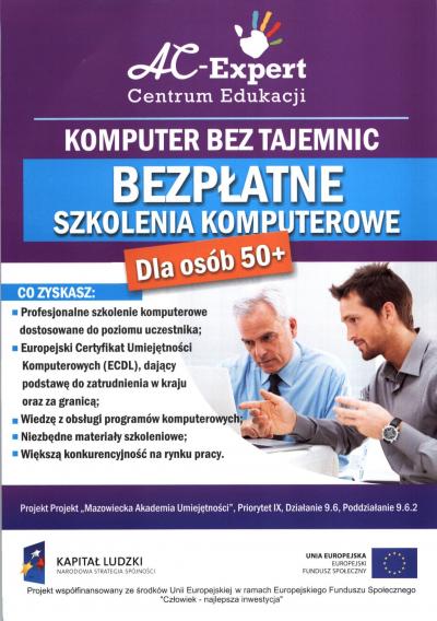 Projekt „Mazowiecka Akademia Umiejętności” współfinansowany jest z Europejskiego Funduszu Społecznego w ramach Programu Operacyjnego Kapitał Ludzki, Priorytet XI Rozwój wykształcenia i kompetencji w regionach, Działanie 9.6. Upowszechnienie uczenia się dorosłych, 9.6.2. Podwyższenie kompetencji osób dorosłych w zakresie ICT i znajomości języków obcych.