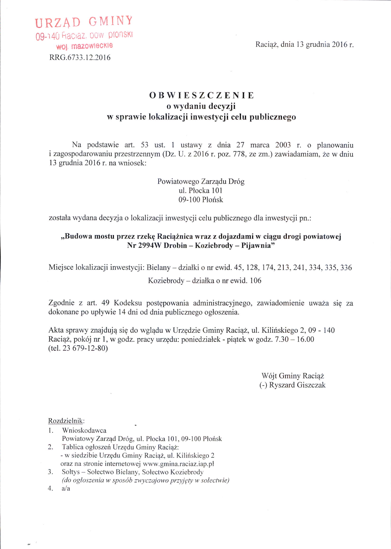 Obwieszczenie - Budowa mostu przez rzekę Raciążnia wraz z dojazdami w ciągu drogi powiatowej Nr 2994W Drobin-Koziebrody-Pijawnia - Aktualności - Gmina Raciąż