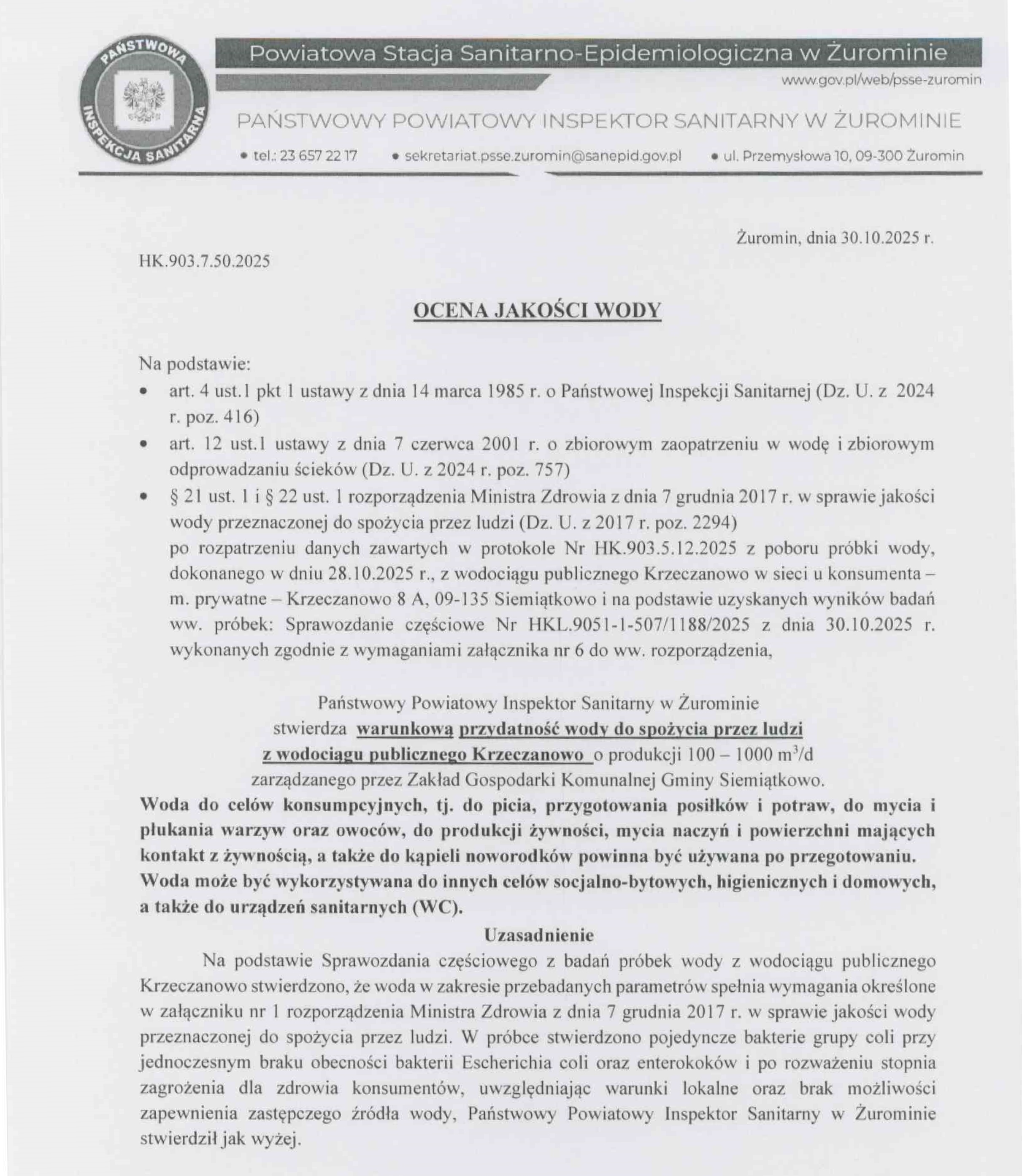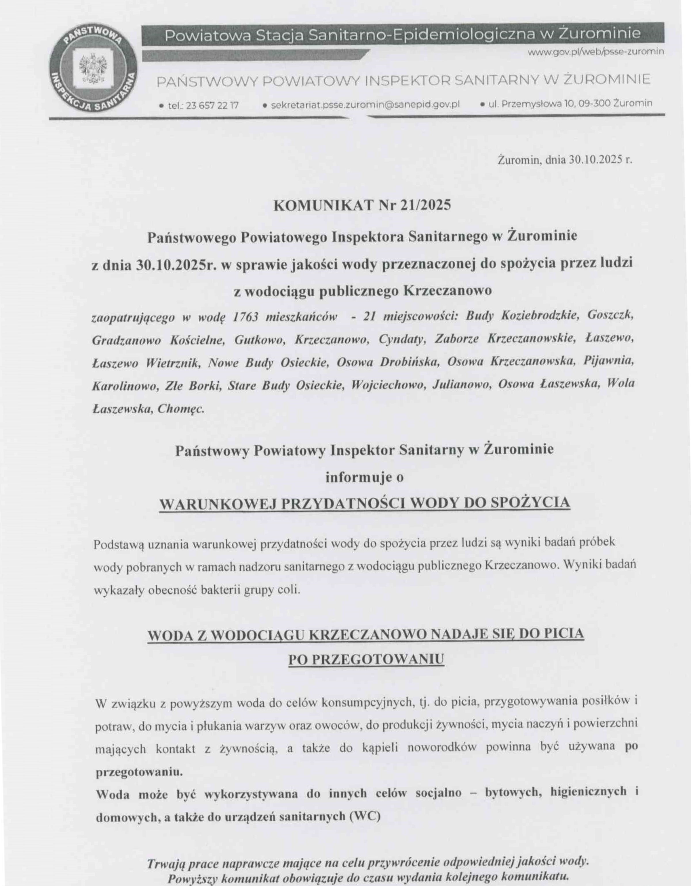 Komunikat nr 21/2025 z dnia 30.10.2025 r. Powiatowej Stacji Sanitarno-Epidemiologicznej w Żuromienie dot. warunkowej przydatności wody do spożycia z wodociągu publicznego w Krzeczanowie