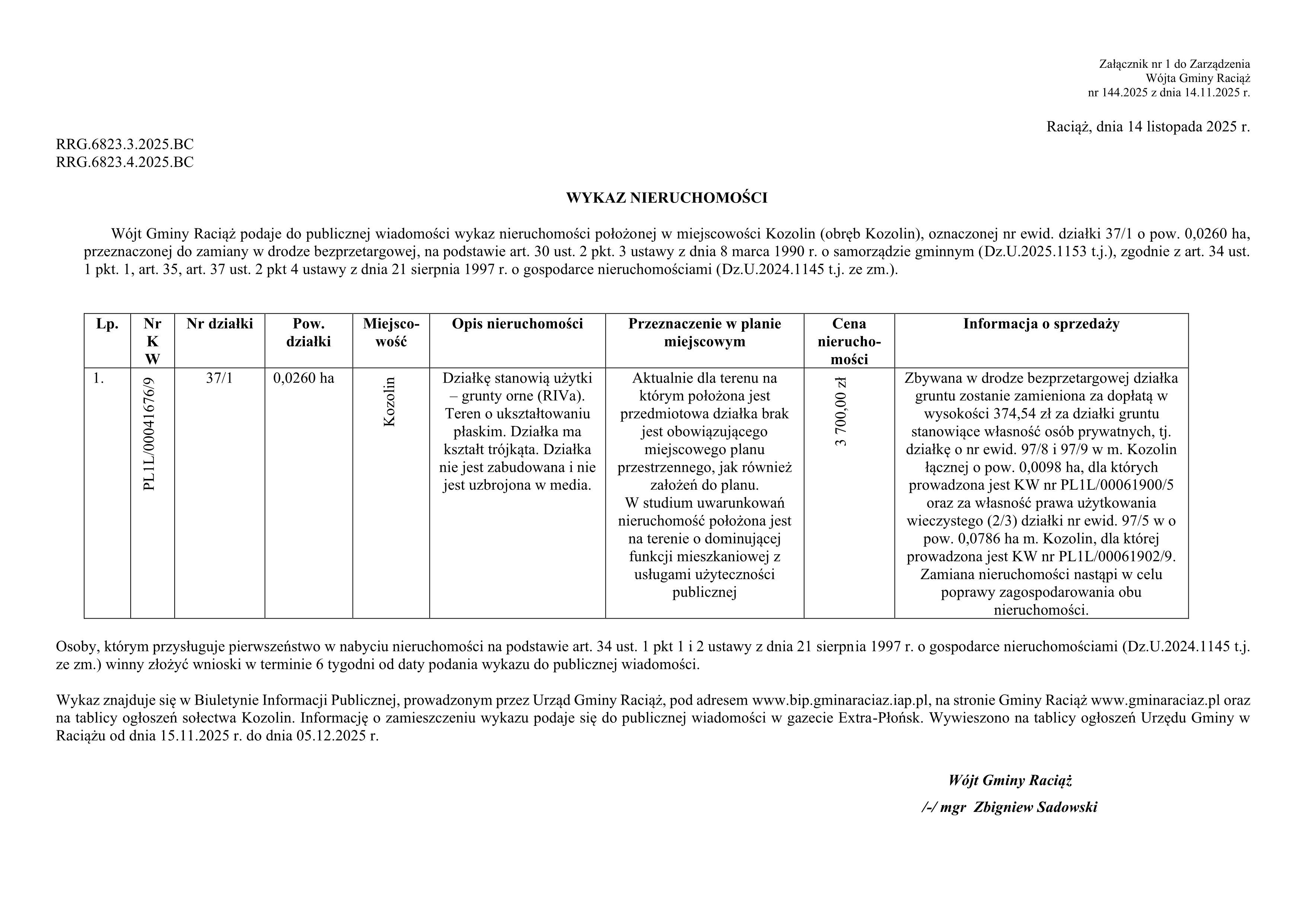 Wykaz nieruchomości położonej w miejscowości Kozolinprzeznaczonej do zamiany w drodze bezprzetargowej - Aktualności - Gmina Raciąż