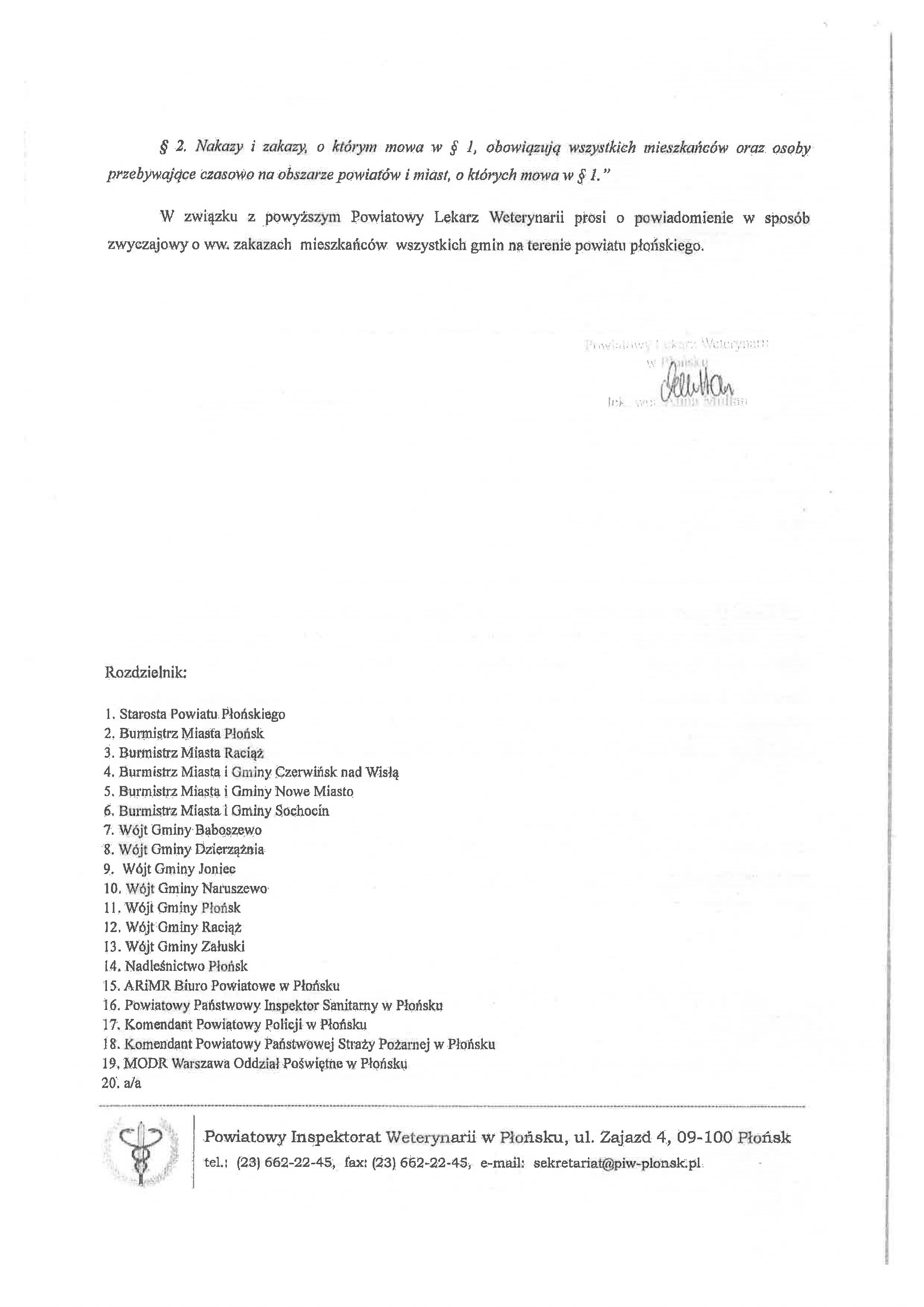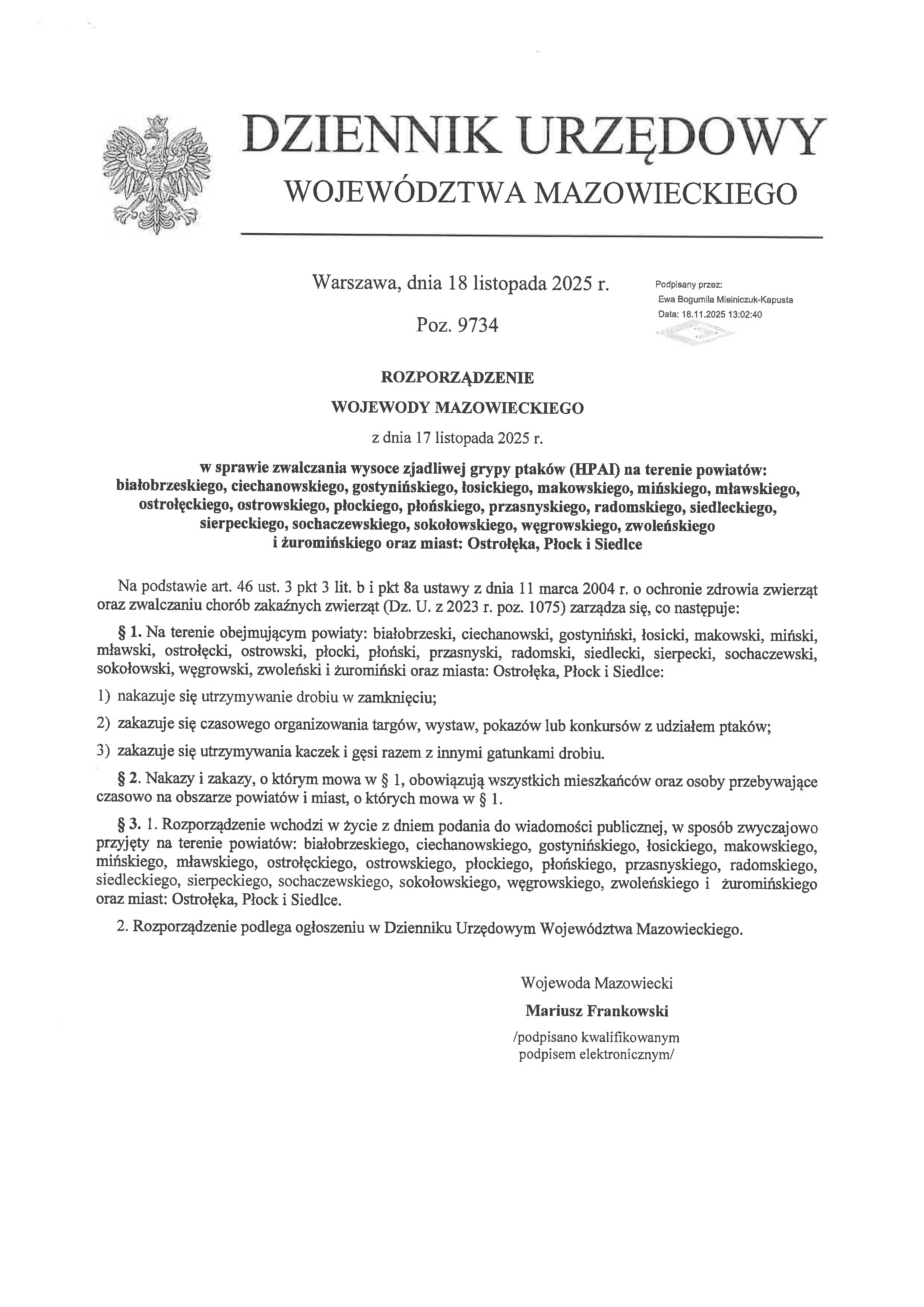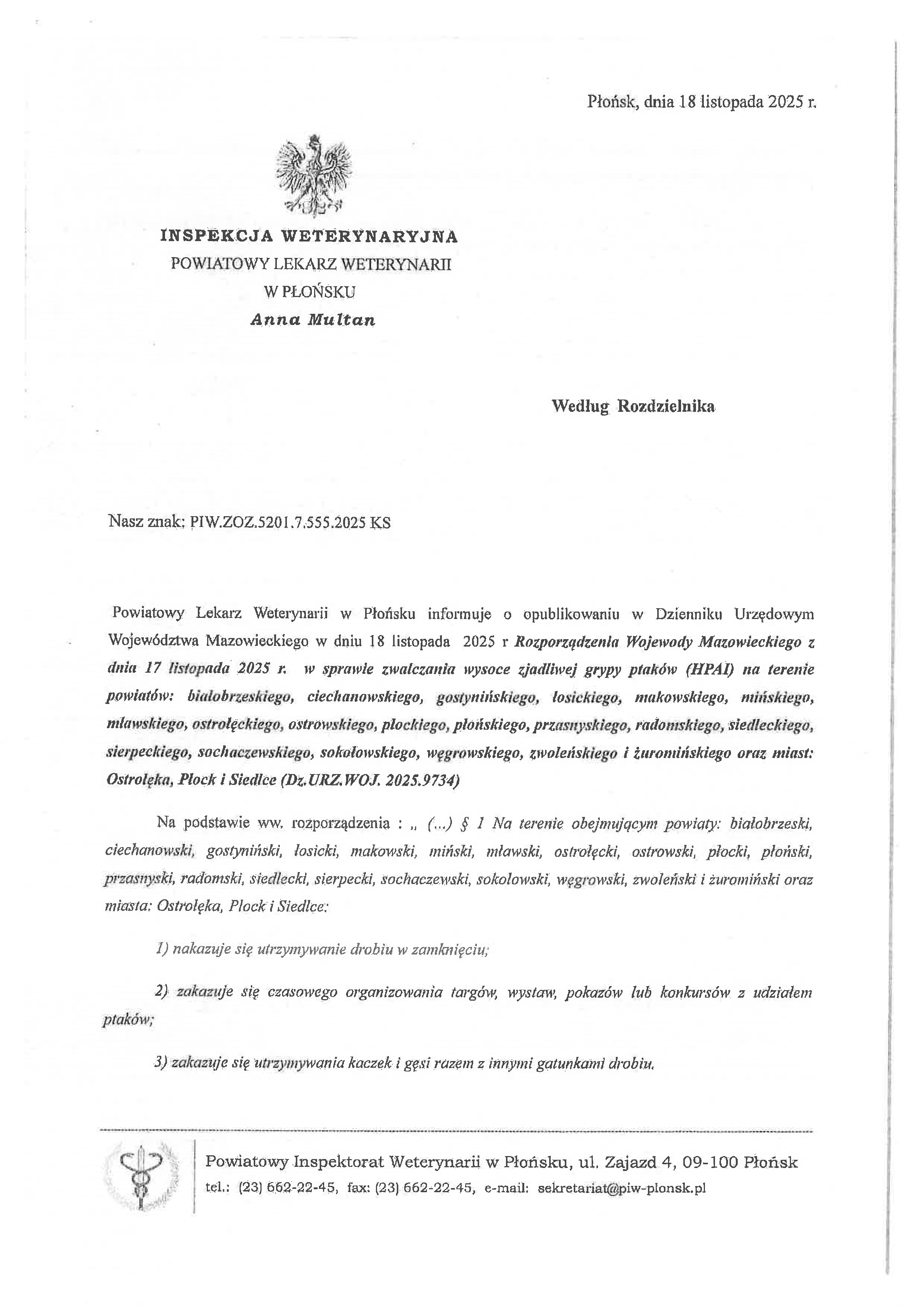 Pismo Powiatowego Lekarza Weterynarii w Płońsku oraz rozporządzenie Wojewody Mazowieckiego dotyczące grypy ptaków - Aktualności - Gmina Raciąż