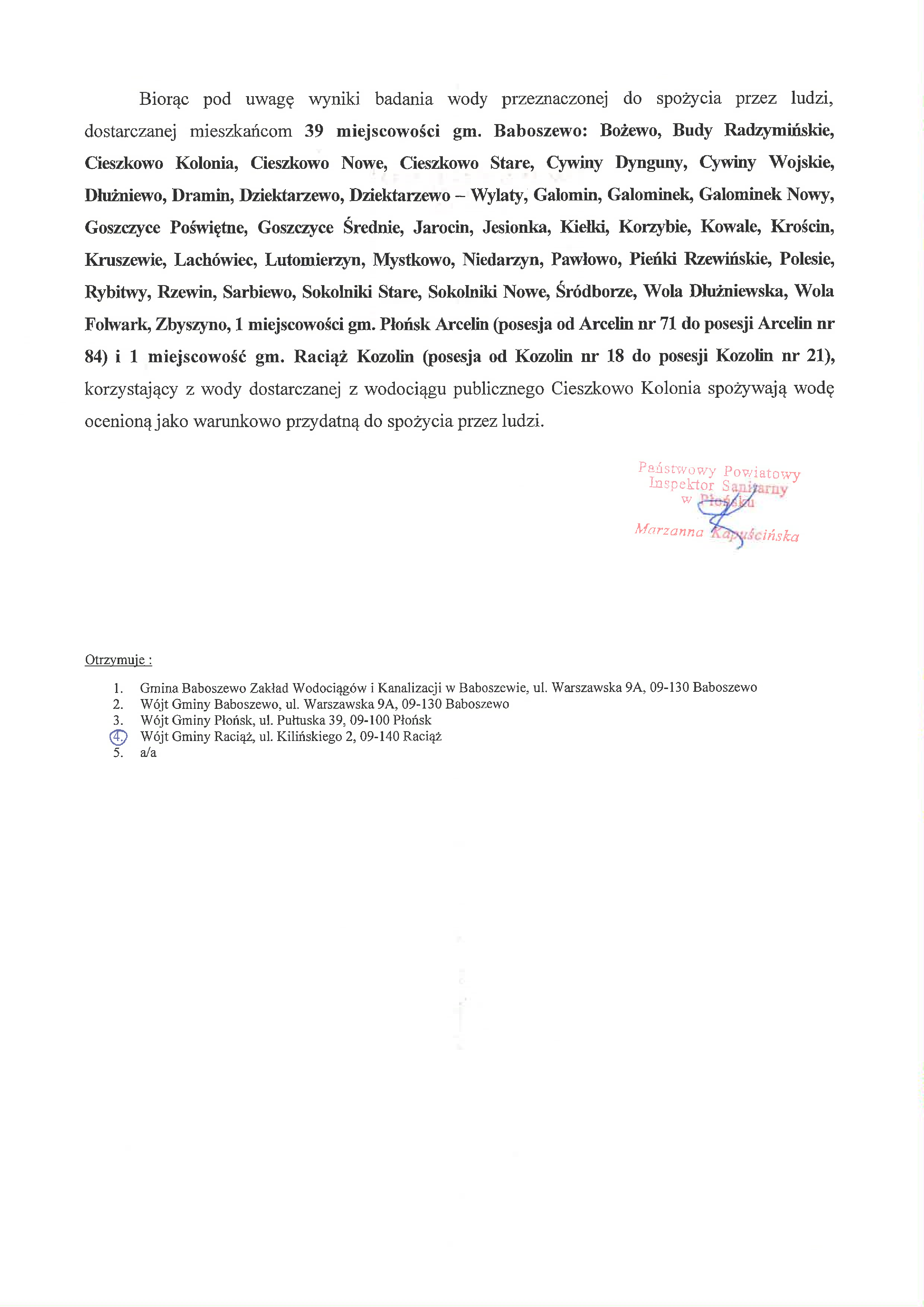 Komunikat w sprawie oceny jakości wody z wodociągu publicznego Cieszkowo Kolonia - Aktualności - Gmina Raciąż