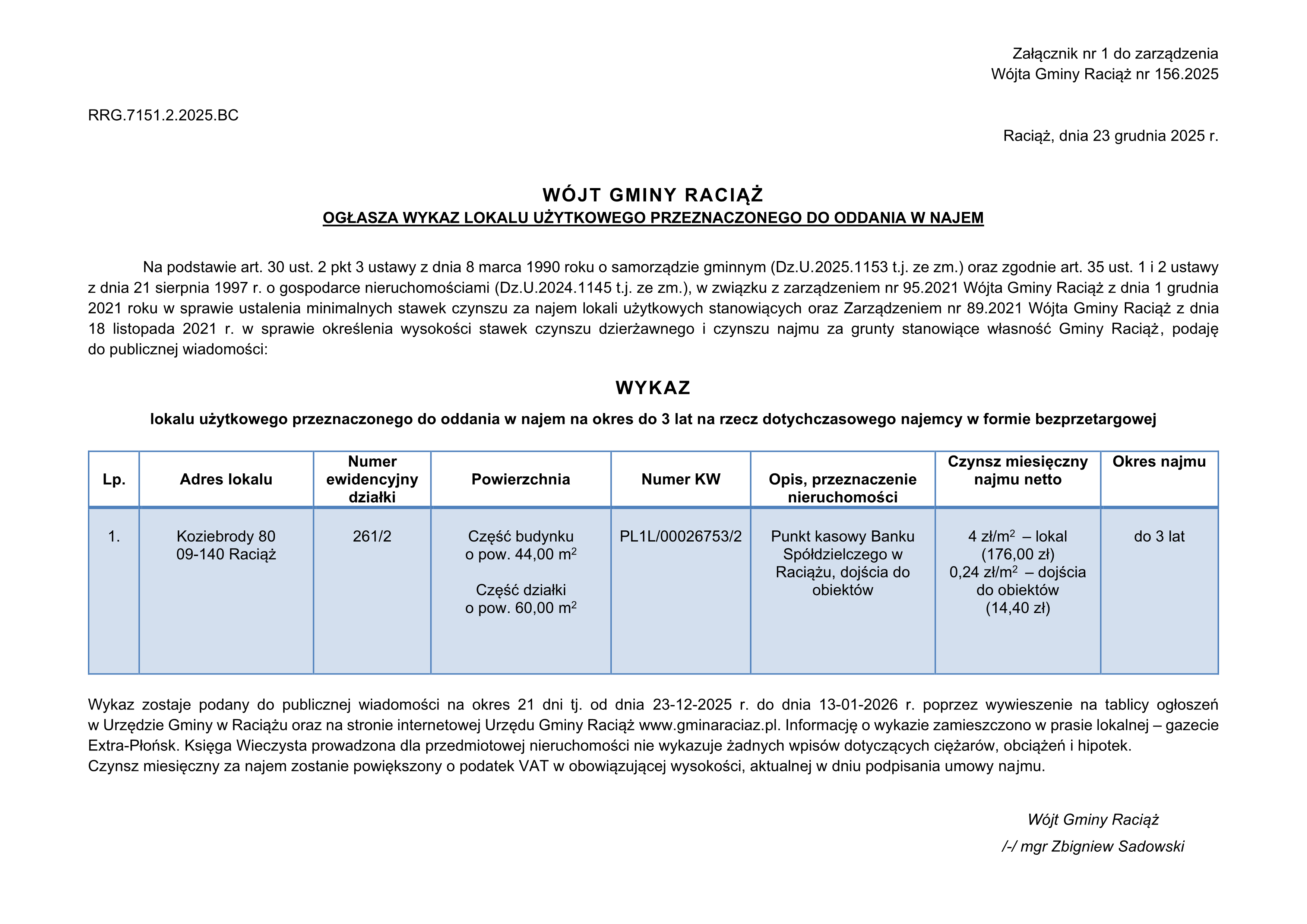 Wójt Gminy Raciąż ogłasza wykaz lokalu użytkowego przeznaczonego do oddania w najem - Aktualności - Gmina Raciąż