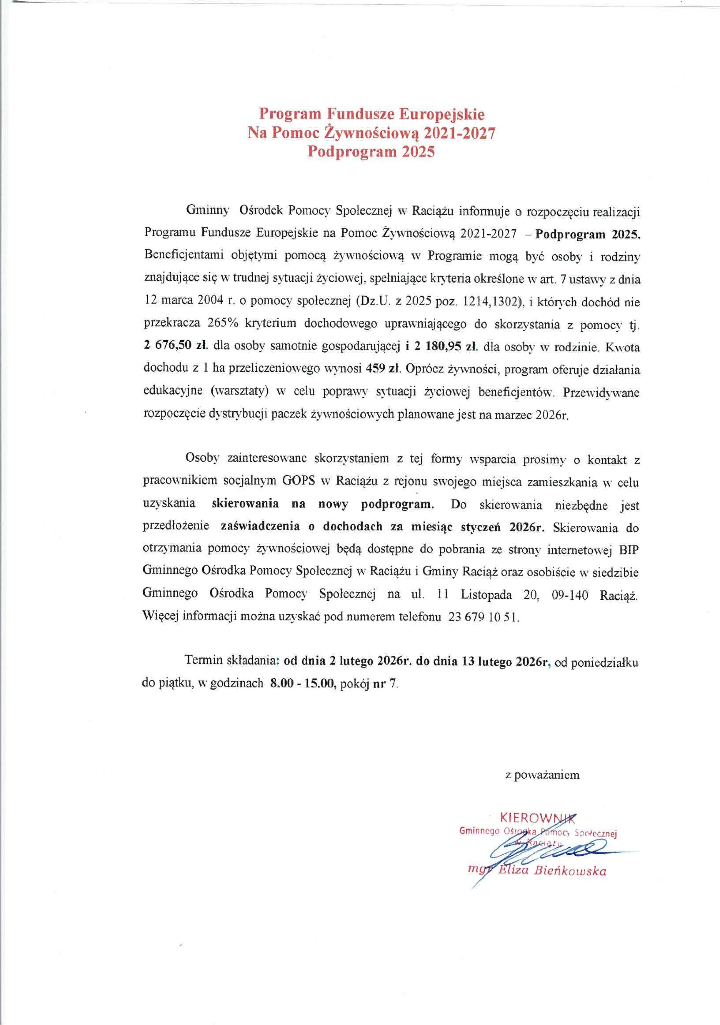 Program Fundusze Europejskie na Pomoc Żywnościową 2021-2027 - Aktualności - Gmina Raciąż