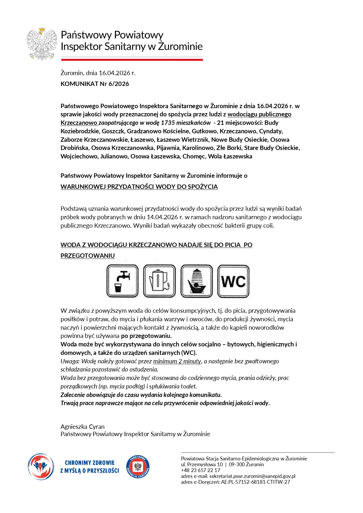 WAŻNY KOMUNIKAT – WODA Z WODOCIĄGU KRZECZANOWO warunkowo przydatna do spożycia. - Aktualności - Gmina Raciąż