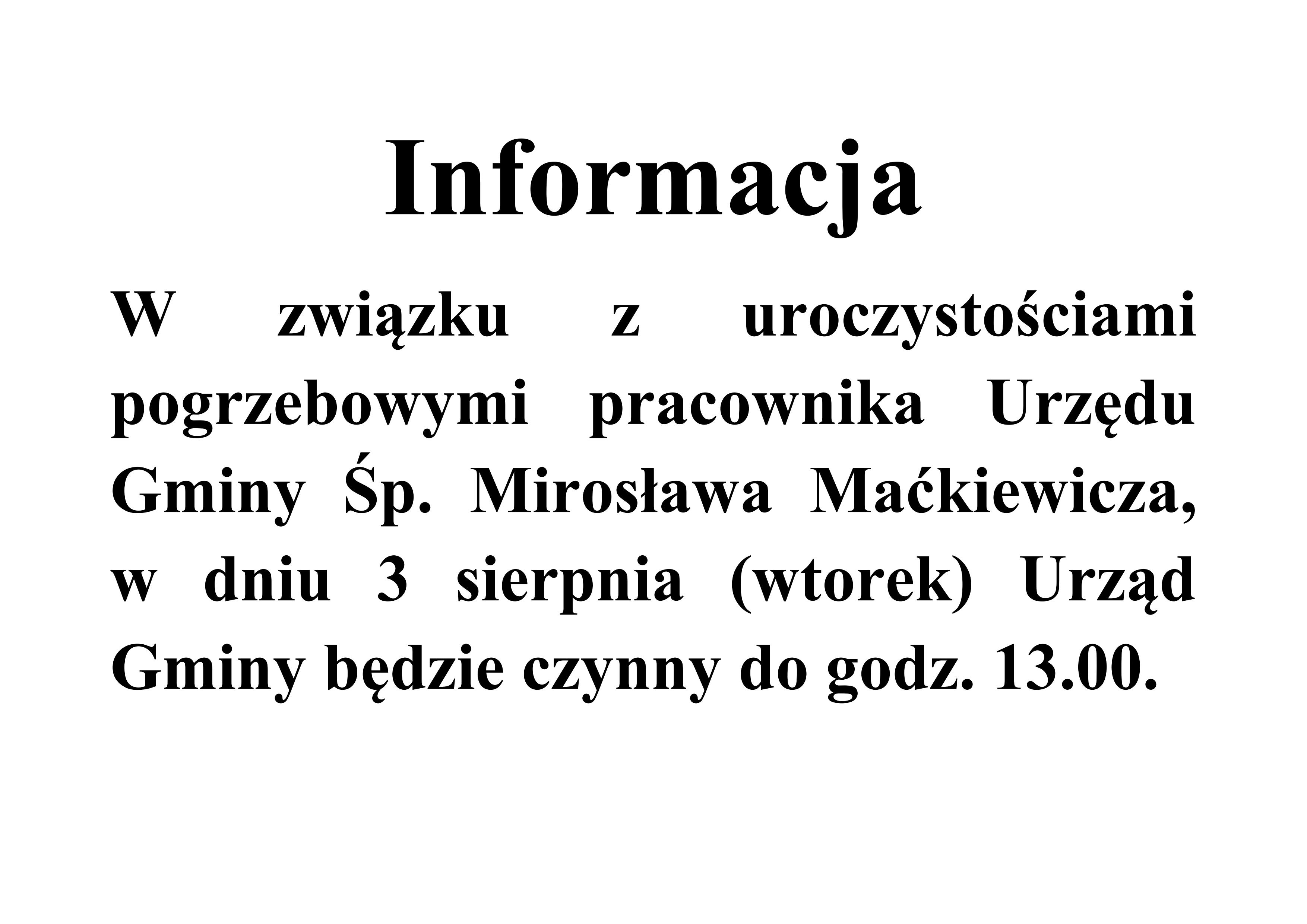 W związku z uroczystościami pogrzebowymi pracownika Urzędu Gminy Śp. Mirosława Maćkiewicza, w dniu 3 sierpnia (wtorek) Urząd Gminy będzie czynny do godz. 13.00....
