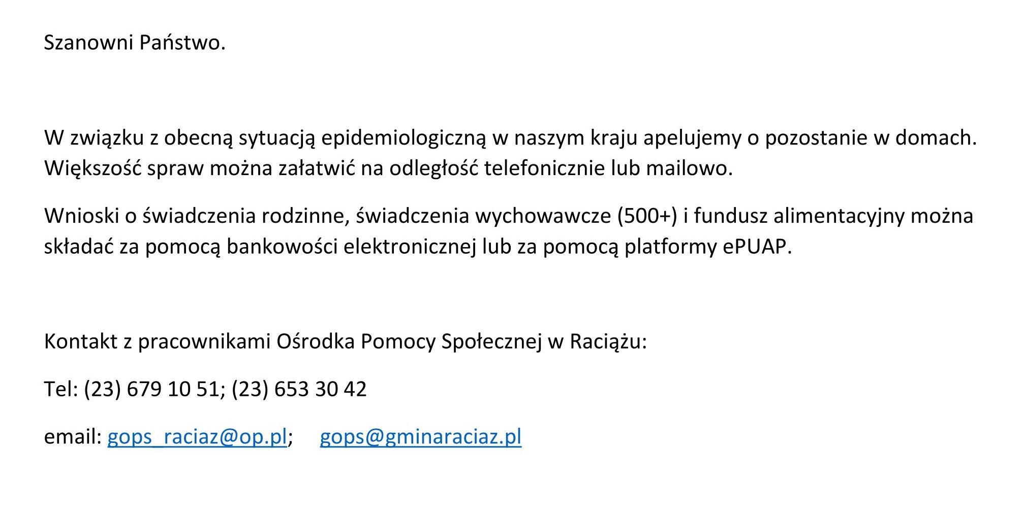 KOMUNIKAT DOTYCZĄCY PRACY URZĘDU GMINY RACIĄŻ ORAZ GMINNEGO OŚRODKA POMOCY SPOŁECZNEJKOMUNIKAT DOTYCZĄCY PRACY URZĘDU GMINY RACIĄŻ ORAZ GMINNEGO OŚRODKA POMOCY SPOŁECZNEJ W związku z obecną sytuacją epidemiologiczną mając na względzie zdrowie pracowników i interesa...