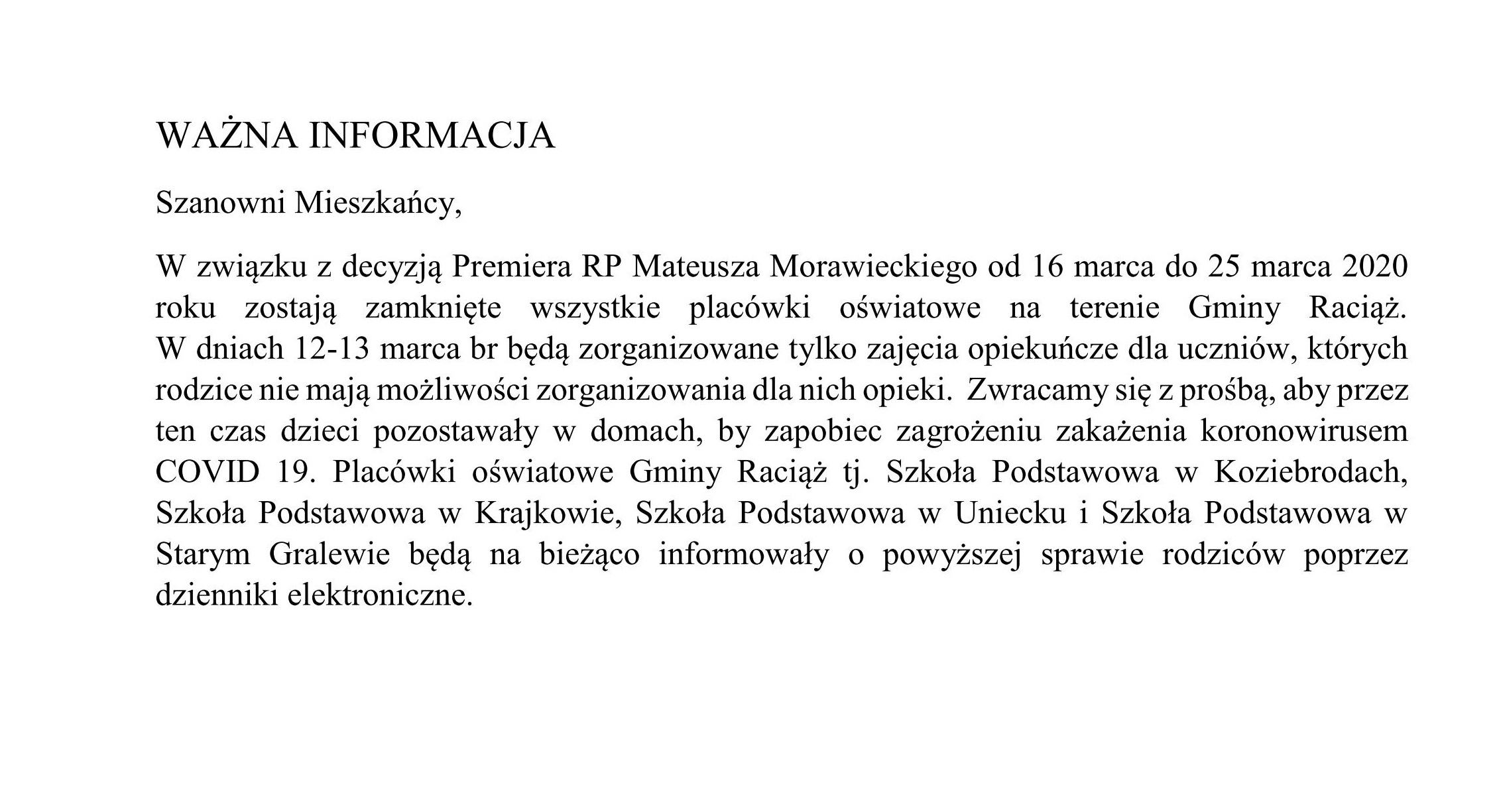 Zawieszenie zajęć dydaktyczno-wychowawczych w przedszkolach, szkołach i placówkach oświatowychOd 12 do 25 marca br. funkcjonowanie jednostek systemu oświaty zostaje czasowo ograniczone. Oznacza to, że w tym okresie przedszkola, szkoły i placówki oświatowe zarówno publiczne, jak i...